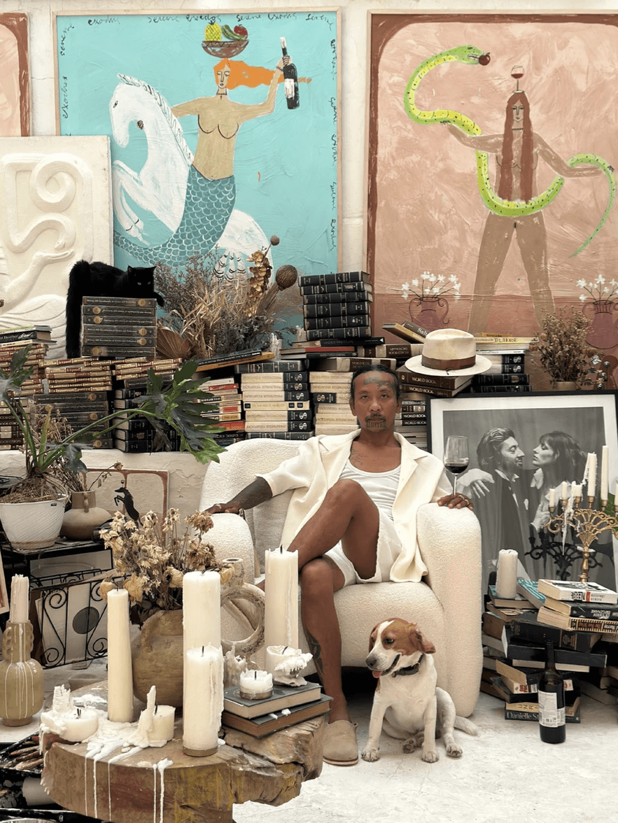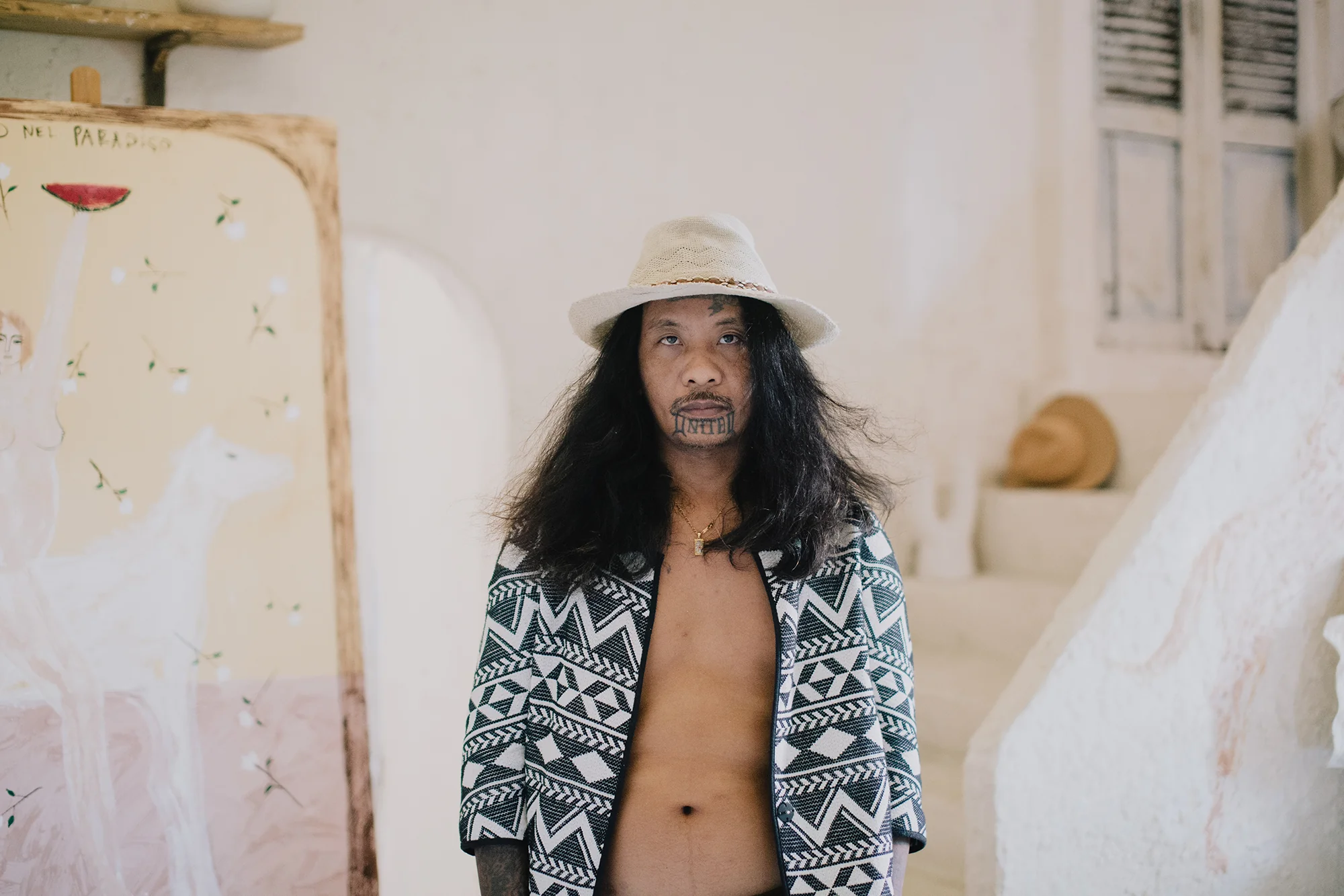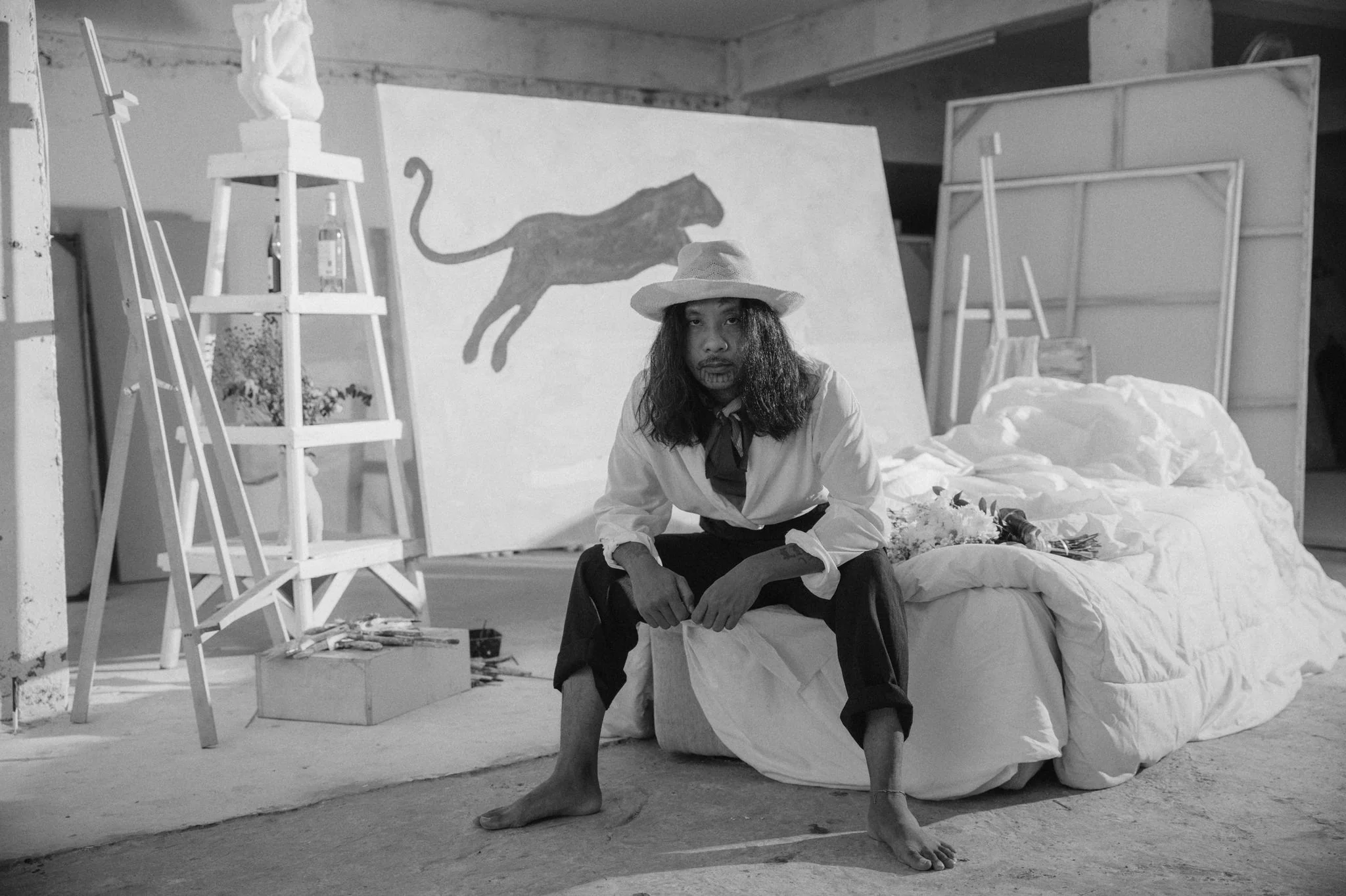 A cinematic hybrid portrait of Indonesian artist Rizz, exploring the physical, mental, and mythic world he constructs in order to create and the life he chooses to live in complete devotion to his art.